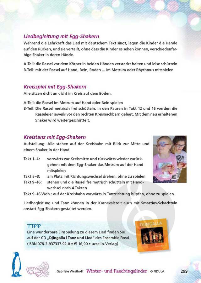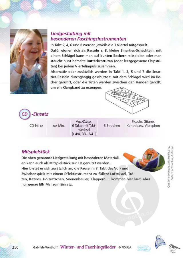 Für die beiliegende CD hat das Ensemble "Fiddletüüt" unter Leitung von Anke Eilhardt wieder ausschließlich auf Originalinstrumenten 25 Lieder instrumental eingespielt, zu denen gesungen, getanzt, gelauscht und musiziert wird. Alle weiteren Lieder sind als mp3-Dateien im separaten Datenteil der CD zu finden. Sie erleichtern in der Unterrichtsvorbereitung die Erarbeitung der Melodien. Auch Kopier- und Malvorlagen, Fotos, Zeichnungen und Bastelanleitungen können von der CD zur Unterrichtsgestaltung direkt ausgedruckt werden.