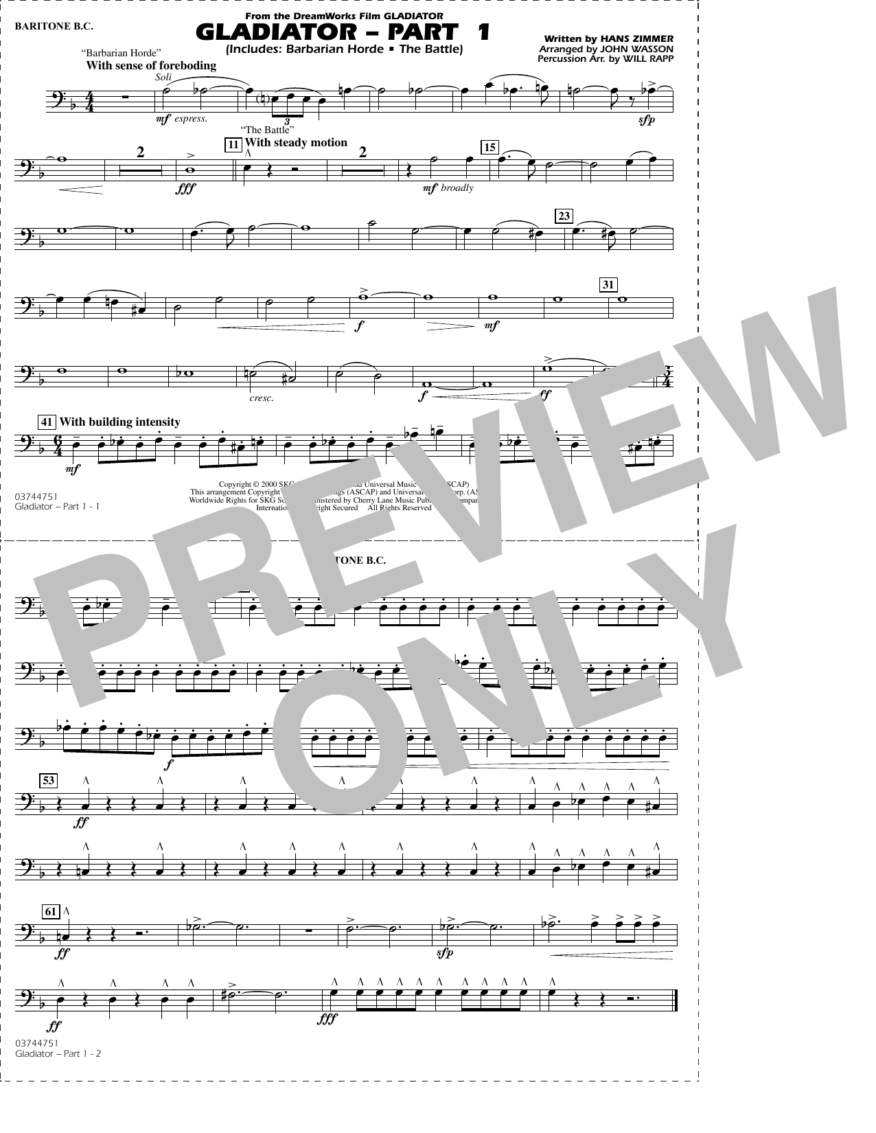 The dramatic and powerful themes of Hans Zimmer helped define the action in this Academy Award-winning movie blockbuster. Skillfully adapted for the marching field by John Wasson and Will Rapp, here is a complete show based on this emotional music. Part 1 includes Barbarian Horde and The Battle. This opener starts out mysteriously before building to the flowing main theme. An intense percussion pattern leads to the exciting battle sequence that closes out this powerful arrangement.