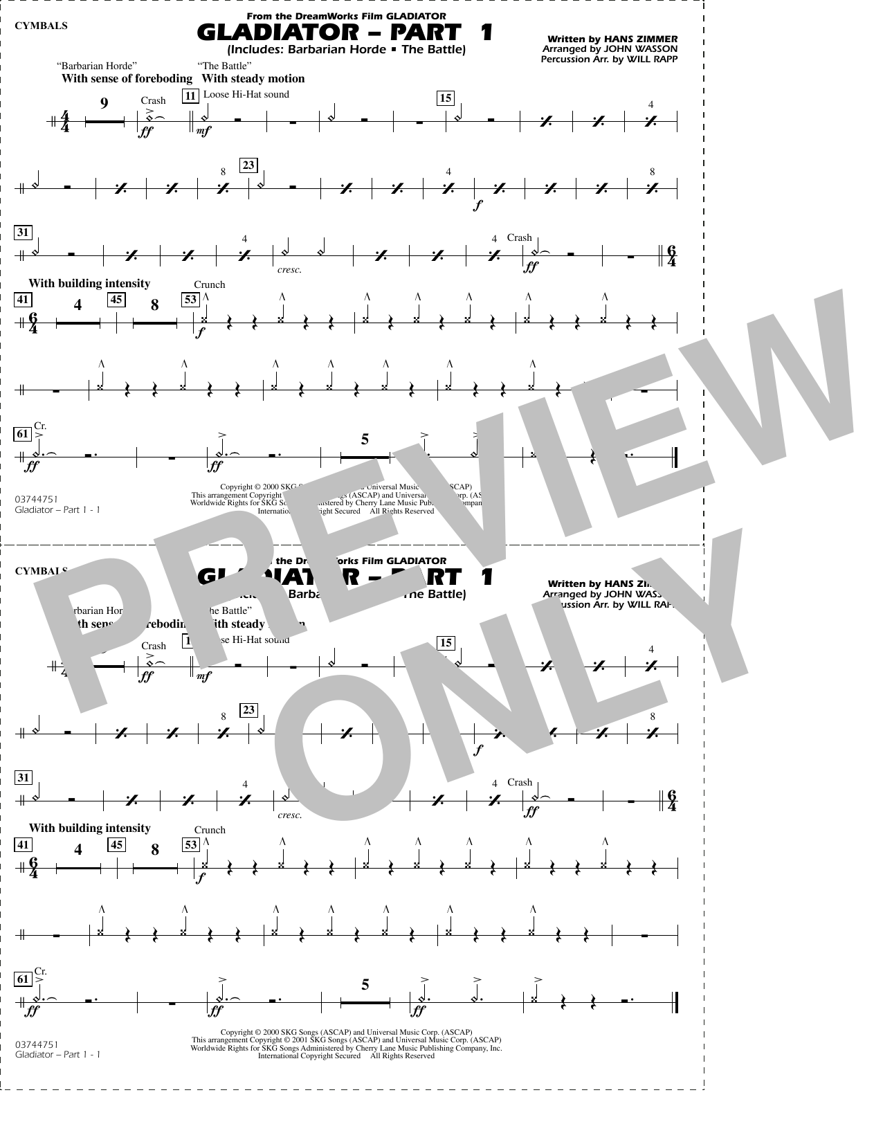 The dramatic and powerful themes of Hans Zimmer helped define the action in this Academy Award-winning movie blockbuster. Skillfully adapted for the marching field by John Wasson and Will Rapp, here is a complete show based on this emotional music. Part 1 includes Barbarian Horde and The Battle. This opener starts out mysteriously before building to the flowing main theme. An intense percussion pattern leads to the exciting battle sequence that closes out this powerful arrangement.
