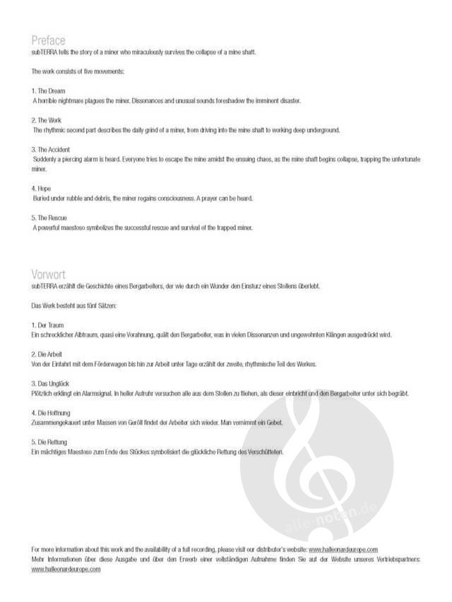 Das Werk subTERRA erzählt die Geschichte eines Bergarbeiters, der wie durch ein Wunder den Einsturz eines Stollens überlebt. In fünf eindringlichen Sätzen zeichnet der österreichische Komponist Daniel Weinberger die Geschichte von der bösen Vorahnung des Arbeiters über den Unfall bis hin zur glücklichen Rettung musikalisch nach: Der Traum, Die Arbeit, Das Unglück, Die Hoffnung, Die Rettung.