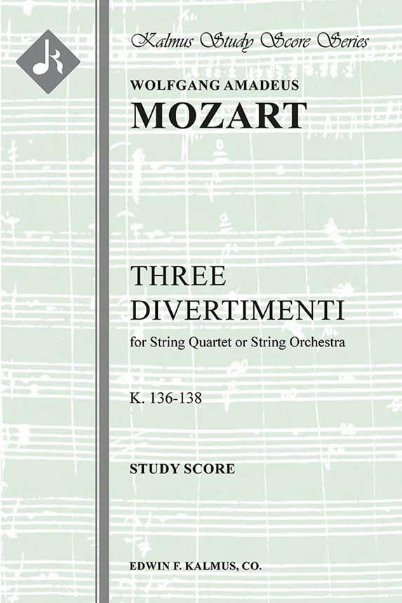 Im Jahr 1772 schrieb der 16-jährige Wolfgang Amadeus Mozart (1756-1791) 7 seiner 41 Sinfonien. Er war gerade von einer Italienreise mit seinem Vater zurückgekehrt, wo er den Auftrag erhalten hatte, eine Serenata für die Hochzeit von Erzherzog Ferdinand und Beatrice D'Este zu schreiben. Neben den Sinfonien schrieb Mozart drei Divertimenti, die für die meisten anderen Komponisten ein eher unbedeutendes Werk darstellten, das Mozart jedoch zu der Komplexität der relativ neuen sinfonischen Form erhob. Die drei Divertimenti aus dem Jahr 1772, K136 - K138, werden oft als seine "Salzburger Sinfonien" bezeichnet. Sie können entweder als Streichorchester oder als Streichquartett aufgeführt werden. Studienpartitur.