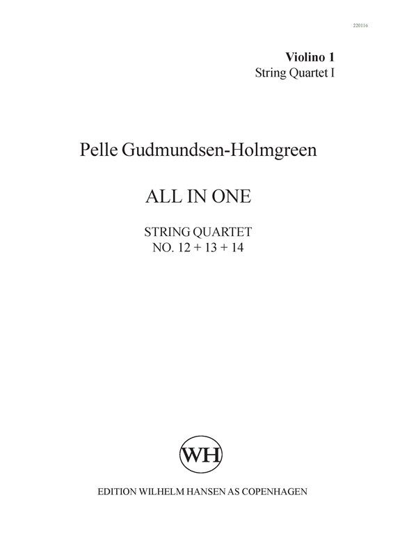 Set of parts for All In One for 3 String Quartets by Pelle Gudmundsen-Holmgreen, composed in 2013(String Quartets No. 12, 13 and 14 played simultaneously). Commissioned by the Kronos Quartet.