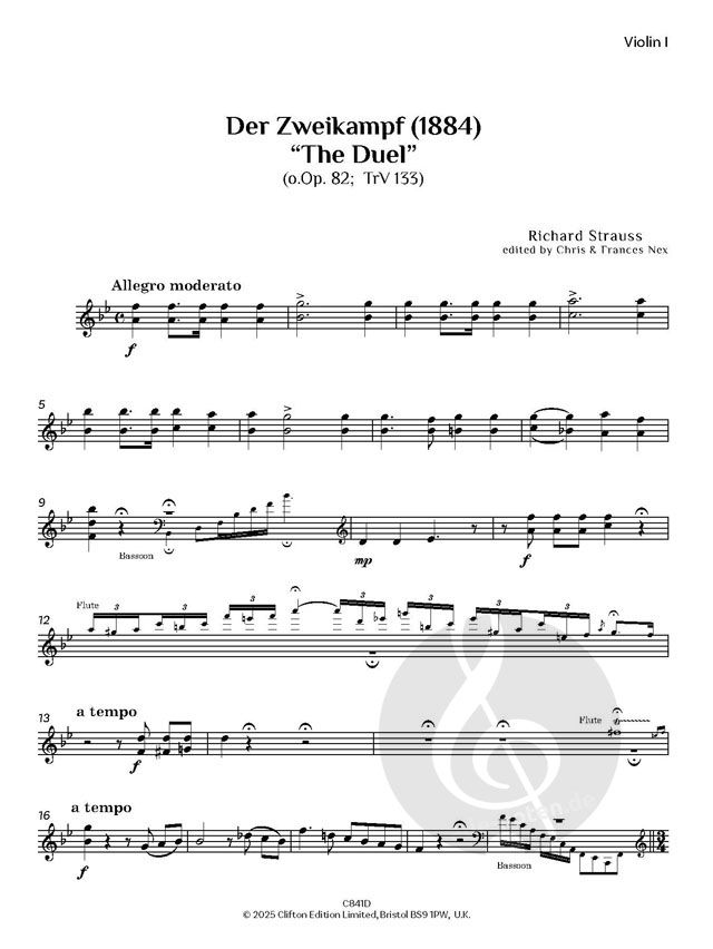 Wir sind auch dankbar für den Hinweis von Dr. Christian Wolf vom Richard-Strauss-Institut in München. Das Werk erscheint in Franz Trenners Richard Strauss - Werkverzeichnis (TrV 133), dem maßgeblichen thematischen Katalog der Werke von Richard Strauss, und ist in der Richard-Strauss-Gesamtausgabe, herausgegeben von Schott Music, unter Orchesterlieder (Balladen) - Der Zweikampf, TrV 133 aufgeführt.