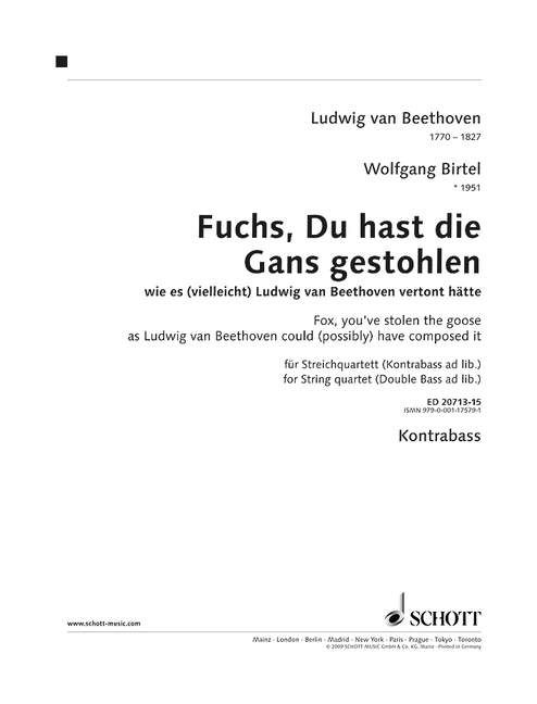 Was haben Beethoven und das Kinderlied 'Fuchs Du hast die Gans gestohlen miteinander zu tun? Eigentlich nichts. Das Lied wurde zwar schon 1824 geschrieben (und theoretisch könnte es Beethoven gekannt haben), aber tiefere Spuren hat es in seinem OEuvre nicht hinterlassen. Doch was wäre, wenn er es gekannt hätte? Wolfgang Birtel ist dieser Frage nachgegangen und hat als Antwort eine Sinfonie für Streichquartett konzipiert: Bei jedem Satz hat ein Beethovensches Sinfonie-Original Pate gestanden (gewürzt mit weiteren Zitaten aus anderen Opera). So taucht das Kinderlied als Hauptthema im Schluss-Satz der 1. Sinfonie auf, im berühmten Trauermarsch der Eroica, das Schicksal pocht in Erinnerung an die 5. Sinfonie an die (Gänsestall-)Tür und mit der Ode an den Gänsebraten (9. Sinfonie) klingt das Werk aus. Eine witzige und geistreich arrangierte Collage, ein Spiel- und Hörvergnügen auf den Spuren Beethovens.