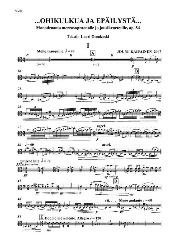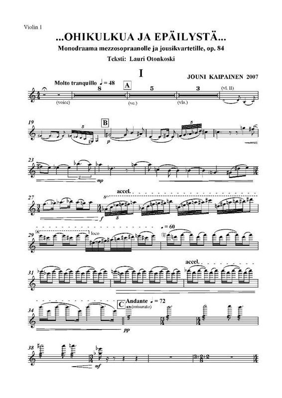 ...OHIKULKUA JA EPÄILYSTÄ...Monodraama mezzosopraanolle ja jousikvartetille, op. 84Teksti: Lauri Otonkoski