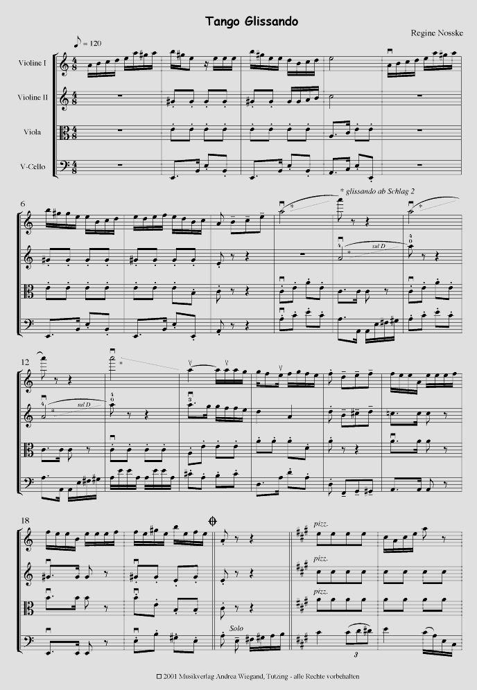 Der Schwierigkeitsgrad der drei oberen Streicherstimmen ist deutlich verschieden; er reicht von sehr leicht mis mittelschwierig. Die dritte Stimme ist wieder sowohl für Viola als auch Violine geeignet und entsprechend in beiden Schlüsseln notiert. Sie beschränkt sich in den Tangos 'El Choclo' und 'Tango de Nochebuena' nahezu vollständig auf die erste Griffart, im 'Tango Glissando' sogar durchgehend! Es können also von Anfängern bis fortgeschrittenen Schülern und Laien wirklich alle mitspielen.
