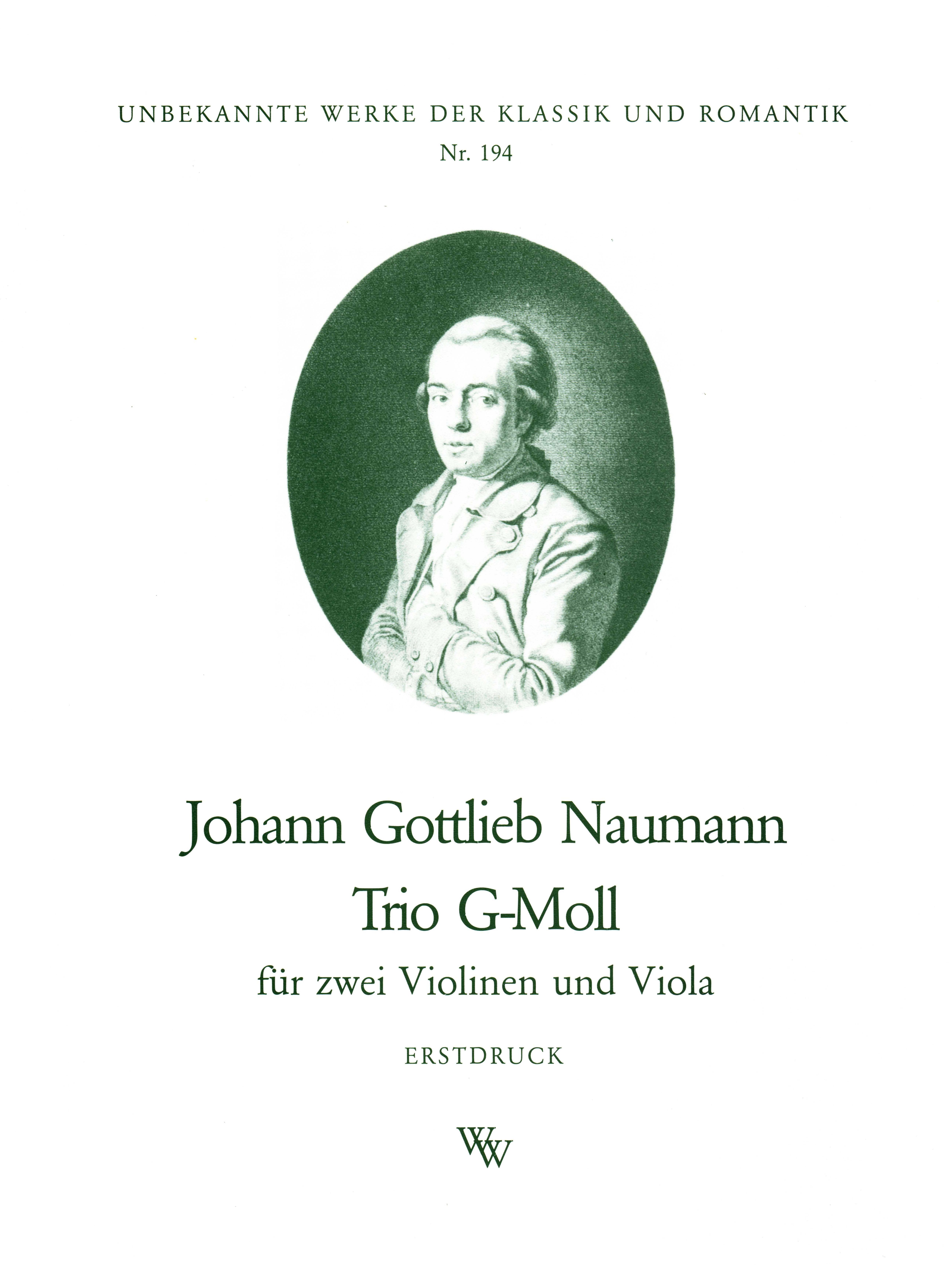 Johann Gottlieb Naumann - am 17. April 1741 in Blasewitz bei Dresden geboren, am 23. Oktober 1801 in Dresden gestorben - gelangte als sechzehnjähriger Reisebegleiter des schwedischen Geigers Wesström nach Italien, wo ihn in Padua Tartini als seinen Schüler aufnahm. 1762 ging er auf dessen Empfehlung zu Padre Martini, um bei diesem seine Studien abzuschliessen. Bereits ein Jahr später debütierte er in Venedig mit einer ersten Opernkomposition auf Anregung von J. A. Hasse, der ihn dann als zweiten Kirchencompositeur an den Dresdner Hof empfahl. 1776 erfolgte die Ernennung zum Kurfürstlichen Kapellmeister, worauf er sich bald vor allem als Opernkomponist internationalen Ruhm erwarb. So gilt Naumann heute aus der Rückschau als die bedeutendste Persönlichkeit des musikalischen Dresden zwischen Hasse und Weber; das Hauptgewicht seines Schaffens liegt auf dem Gebiet der Oper und der geistlichen Musik. Das Autograph des hier erstmals im Druck vorgelegten Trios befindet sich im Archivio Musicale della Cappella Antoniana zu Padua. Der Biblioteca Antoniana, Basilica del Santo, sei für das Zurverfügungstellen einer Kopie und für die Erlaubnis zur Publikation herzlich gedankt. Das Titelblatt mit Nauetanns edel geschwungenem Schriftzug weist als Entstehungszeit für diese Komposition seine erste schöpferische Zeit aus, als er noch bei Tartini das Violaspiel studierte (um 1762). Daraus erklärt sich wohl auch die in der frühklassischen Zeit seltene Besetzung für zwei Violinen und Viola. (Naumann verwendet die im 18. Jahrhundert für die Bratsche übliche Bezeichnung 'Violetta'.) Das gut lesbare Notenbild bietet einen sorgfältig gearbeiteten Text, der nur wenige durch [ ] gekennzeichnete Ergänzungen seitens des Herausgebers notwendig erscheinen liess.