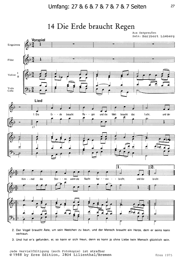Streichquartett, Flöte (ad lib.) Deutsche Volkslieder aus alter und neuer ZeitInhalt:Wenn alle Brünnlein fliessen (Schwaben)Ich wollt ein Bäumlein steigen (Thüringen)Auf, auf, ihr Wandersleut (Nordböhmen)Ich bin das ganze Jahr vergnügt (Bessarabien)Jetzt kommt die Zeit (Hessen)Hast du Lust, mein Bruder du (Deutschland)Herz, in deinen sonnenhellen Tagen (Heribert Limberg)Der hat vergeben das ewig Leben (Rathgeber)Die Gedanken sind frei (Hessen)Wer jetzig Zeiten leben will (Fliegende Blätter 17. Jhh.)Zu Frankfurt an der Oder (Deutschland)Zogen einst fünf wilde Schwäne (Ostpreussen)Ich armes welsches Teufli (Deutschland)Die Erde braucht Regen (Ostpreussen)Kein schöner Land (Deutschland)Einrichtung von Heribert Limberg für Singstimme (Melodieinstrument), Streichquartett und Flöte ad lib. und/oder andere variable Besetzungen (Holz- oder Blechblasinstrumente, Klavier). Ausstattung: jeweils Partitur mit allen Instrumentalstimmen (Viola auch als Violine III)
