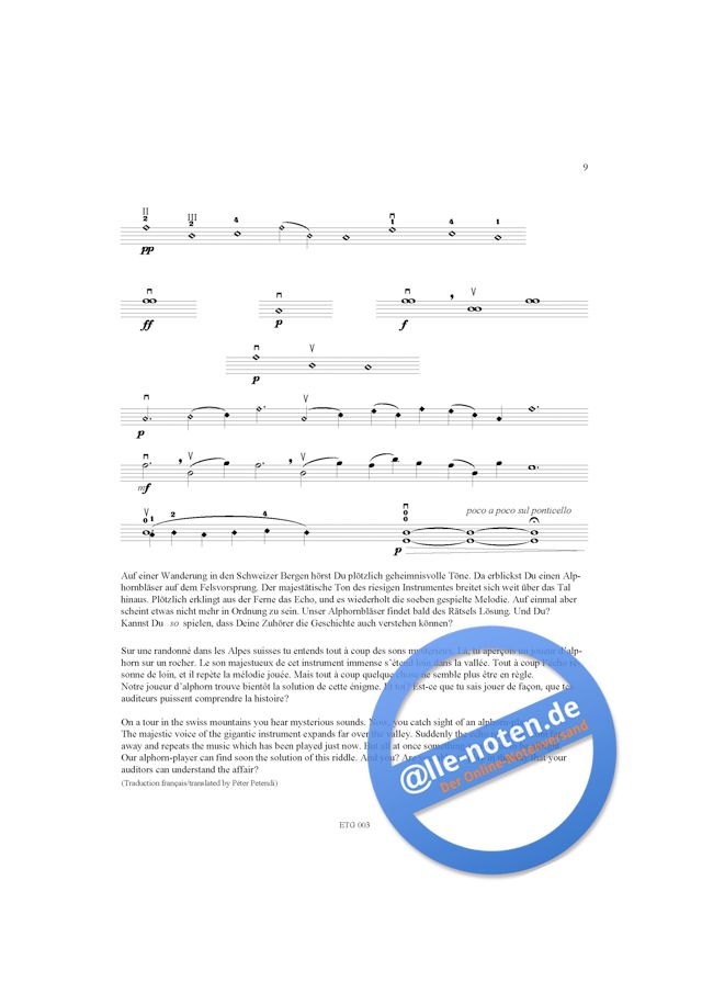 'Diese 9 Solostücke für Violoncello könnten auch als Etüden bezeichnet werden. Sie sind mit pädagogischer Absicht geschrieben worden, als Ergänzung zu der klassischen Unterrichtsliteratur. Jedoch nicht das Erlernen der 'Lagen' oder der 'Stricharten' bildet das Ziel, sondern einzig der Ausdruck im Spiel. Die Beherrschung der Technik ist dabei nur Mittel zu dem Zweck, das Nicht-Notierbare, Nicht-Beschreibbare in der Musik zum Leben zu erwecken.