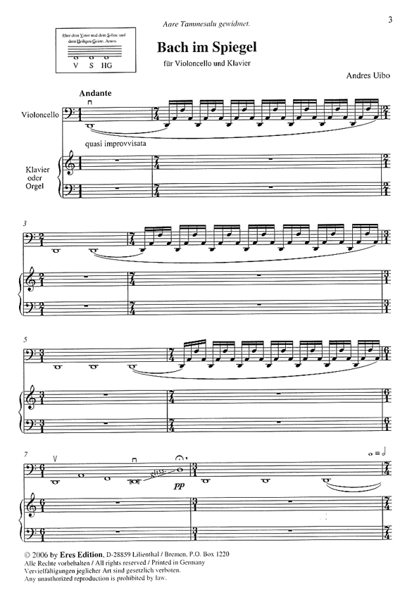 Das Stück 'Bach im Spiegel' für Violine und Klavier (Orgel) ist eine zugleich meditative und expressive Ehrerweisung an Johann Sebastian Bach, in dem wir aber auch ein an Arvo Pärt erinnerndes Gleichgewicht und die Dramatik der 'Fantasie über B-A-C-H' von Artur Kapp wiederfinden. Uibo zufolge ist Bach nicht mehr einfach nur Komponist, sondern eine 'höhere Geistigkeit', deren Botschaft sich erst auf einer anderen Ebene eröffnet. In Uibos Musik finden wir daher die Bachsche Musik nicht um des puren Zitierens willen, vielmehr ist Bach für den Komponisten ein höheres, geistiges Vorbild.Das Werk lässt sich in mehrere Abschnitte unterteilen, darunter sind auch ein 'Prolog' und ein 'Epilog'. Das Soloinstrument beginnt 'quasi improvisata' und auf einem langen d, welches gleich darauf zu einem schnellen und innerlich belebten, arpeggierten d-Moll Klangfeld wird. Danach werden aus dem langen Anfangston zwei, später drei, diese verkörpern den Vater, den Sohn und den heiligen Geist. Als Kontrast dazu symbolisieren dem Komponisten zufolge die schnellen Passagen die nervöse und ruhelose Tätigkeit der Menschen. Das rhapsodiehafte Werk, von dem es auch eine Fassung für Violoncello und Klavier gibt, ist frei fliessende Musik, deren Klangkraft und die expressive Solopartie teilweise sehr dramatische Gefühlserregungen hervorrufen. Die Kadenz bzw. freie Improvisation des Cellos zu Beginn des letzten Drittels des Stückes erinnert an Solopartiten und Fantasien im Stile der Bachzeit. Das Werk endet mit einem 'Epilog', bei dem die gleichen Elemente wie im 'Prolog' des Satzes Anwendung finden, zum Schluss klingt im tiefen Register nur noch das d, welches auch der Grundton der im gesamten Werk vorherrschenden Haupttonart in Moll ist.