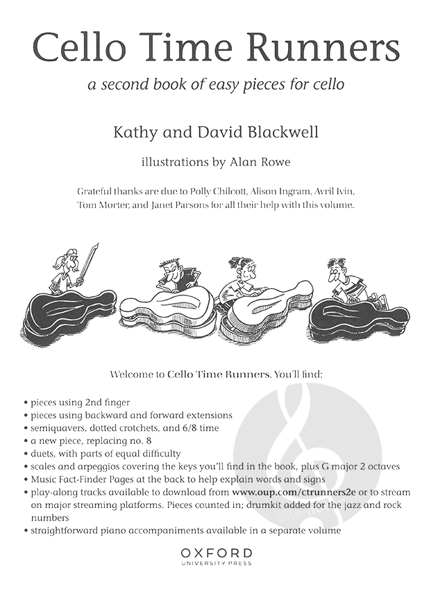 Cello Time Runners is the second book in the popular Cello Time series, which is enjoyed by students and teachers all over the world. It contains Kathy and David Blackwell’s trademark attractive and engaging compositions that appeal to learners of all ages. Lively original pieces, traditional tunes, and duets in a variety of styles use 1st and 2nd fingers, as well as backward and forward extensions.