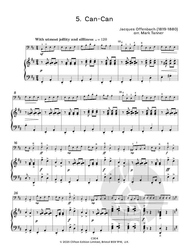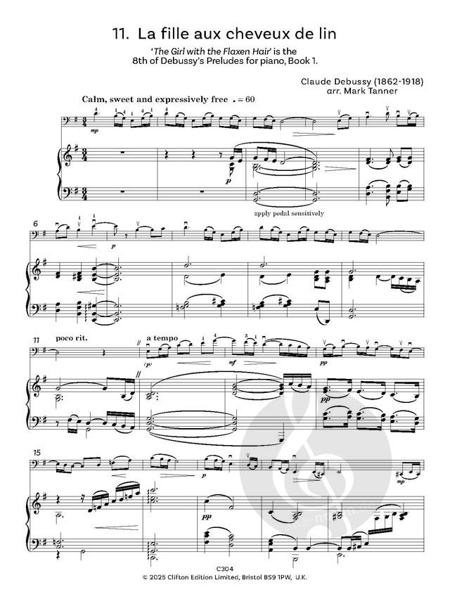 Bei der Zusammenstellung dieses Dutzends von Arrangements habe ich schamlos aus einem langen und reichen Fundus französischer Musik ausgewählt. Ich bin zuversichtlich, dass jüngere Spieler und diejenigen, die noch nicht so lange Cello spielen, an meiner Auswahl Gefallen finden werden. Verzeihen Sie mir den augenzwinkernden Titel des Buches, Französische Baguettelles (ich bin zur Hälfte Franzose, also fühle ich mich nicht allzu schuldig!), denn die Musik hier hat mehr als nur einen Hauch von Knoblauch an sich. Abgesehen von Sur le Pont d'Avignon, das angeblich im 15. Jahrhundert geschrieben wurde, Frère Jacques, einem populären Lied aus dem 18. Jahrhundert, und Tambourin, das höchstwahrscheinlich ebenfalls im 18. Jahrhundert geschrieben wurde, stammen alle Stücke von Komponisten, die in der Romantik lebten. Ravel und Debussy waren natürlich für ihre impressionistischen Farben bekannt, obwohl diese Eigenschaft in den meisten Fällen in den Begleitungen am deutlichsten zum Ausdruck kommt. Ich habe mich bemüht, die Klavierstimmen für Normalsterbliche spielbar zu halten, da ich mir der Tatsache bewußt bin, daß Cellolehrer vielleicht keine virtuose Klavierbegabung besitzen, aber dennoch ihre Schüler bei Konzerten, Festivals, Prüfungen usw. begleiten möchten.