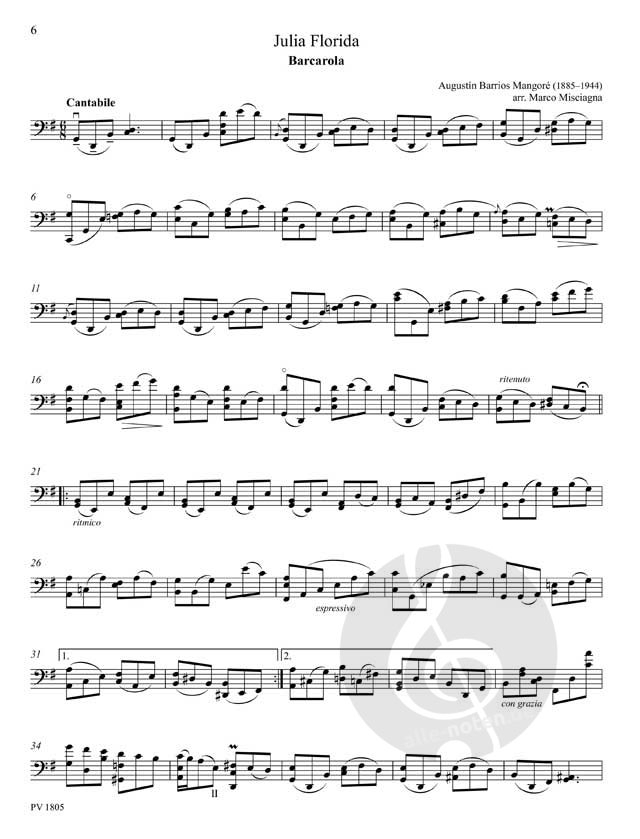 La Catedral (1921), gehört zu den berühmtesten Werken von Barrios Mangoré, ein dreiteiliges Stimmungsbild aus dem Innenraum einer südamerikanischen Barockkathedrale. Julia Florida, Barcarola (1938), ist ein Liebeslied, geschrieben für seine Schülerin Julia «Florida» Martinez.