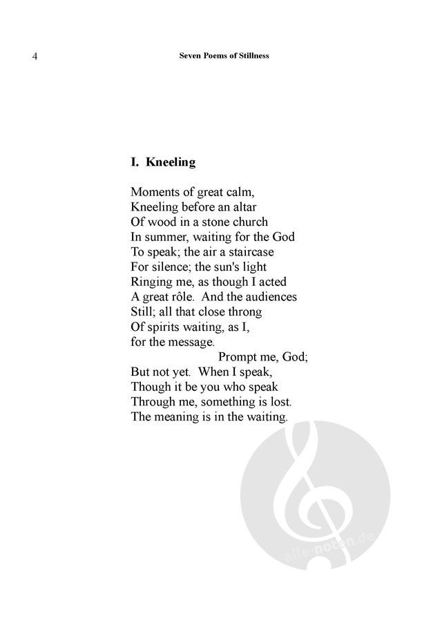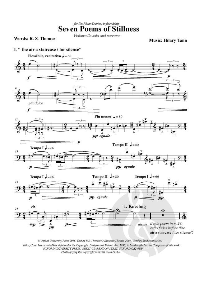 This continuous cycle (c.16 minutes without narrator, c.24 with narrator) intersperses seven poems by R. S. Thomas with seven movements for solo cello. The music is evocative, moving, and thoughtfully sets the mood for the poem that it precedes. A recording of this work, performed by the cellist Guy Johnson, is available from Ty Cerrd (TCR011).