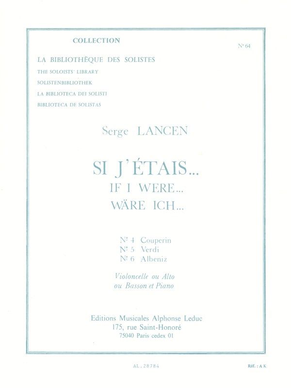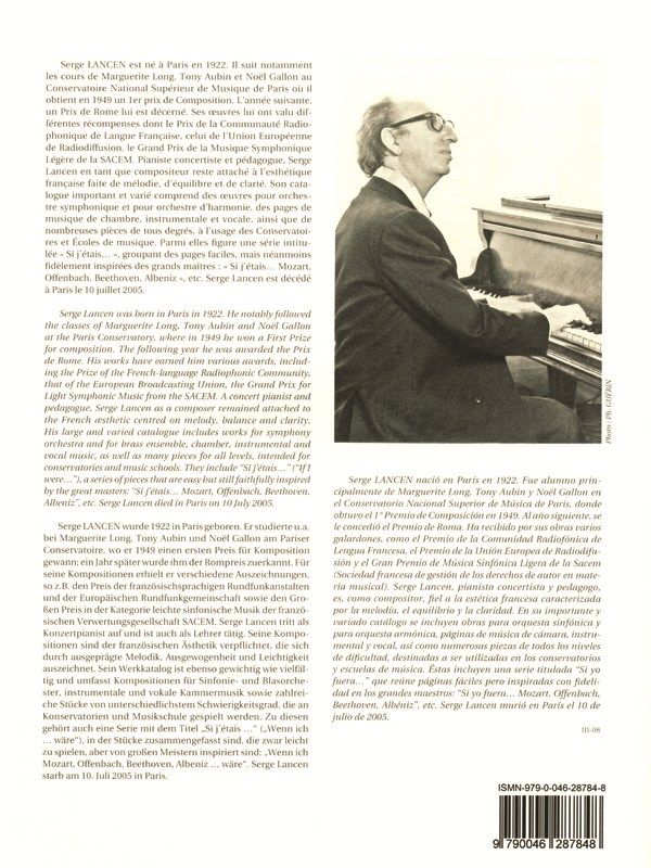 Si J'Étais... is a series of compositions by Lancen in which each piece depicts the style of a different great composer. Numbers 4, 5 and 6 are influenced by Couperin, Verdi and Albeniz. Adaptable to Cello, Viola or Bassoon, these Lancen pieces are exciting and informative, ranging across a variety of musicalstyles. SiJ'Étais... is suitable for intermediate instrumentalists.