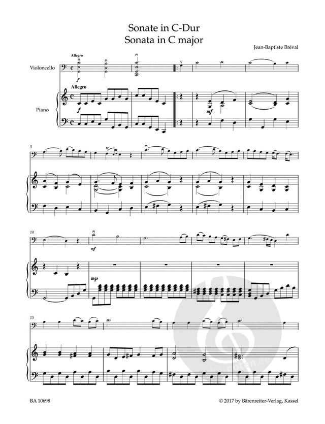 Jean-Baptiste Bréval (1753-1823) war Mitglied im Orchester der Pariser Oper und ein sehr aktiver Komponist: Zu seinen Werken zählen Cellokonzerte, Streichquartette, Komische Opern sowie ein Schulwerk für Violoncello. Bekannt geworden ist er aber hauptsächlich durch sein op. 40/1, die vorliegende Sonate in C-Dur. Sie ist zum Klassiker der Unterrichtsliteratur geworden, auch in Bearbeitungen für andere Instrumente. Die beiden Sätze (Allegro und Rondo Grazioso) sind auch für separate Aufführungen geeignet. Die C-Dur-Sonate gehört zur Grundausstattung junger Cellisten.
