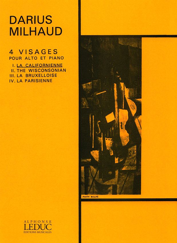 First of the series of 'Quatre Visages' by Darius Milhaud, I. La californienne is a short piece for Viola and Piano. With some difficulties, it requires some intermediate technique of the instrument and some theory knowledge toread in different keys. The book includes the score for Viola and Piano and the part for Viola only. The music has moderate tempo and is quite expressive. It is supposed to represent an American girl from California. She is partof the four faces with: II. The Wisconsonian, III. La Bruxelloise and IV. La Parisienne. Darius Milhaud (1892-1974) was a French modernist composer and a teacher. He was also part of Les Six and was strongly influenced by Jazz. His opus list ended at 443.