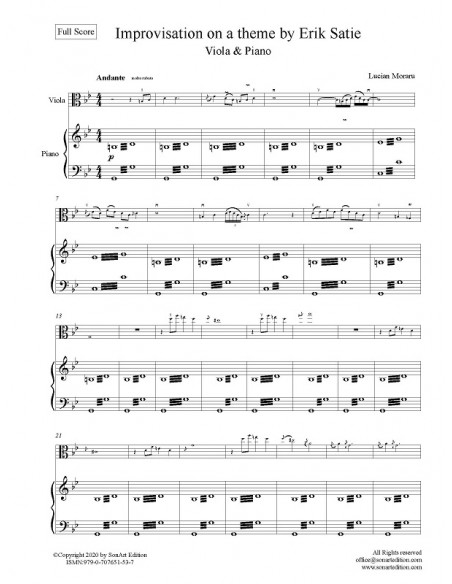 Dies ist eine einzigartige Improvisation für Bratsche und Klavier nach einem Thema von Erik Satie und zu der andere Originalthemen hinzugefügt wurden. Die Arbeit wird sicherlich eine Freude für das Publikum sein, weil das Klangmaterial sowohl im klassischen als auch im jazzigen Stil behandelt wird. Sicherlich ist dies ein Stück, das die Spieler genießen können, aber das Publikum hat gezeigt, dass es das gleiche Vergnügen teilt und ist sicherlich eine kluge Wahl für die Spieler, die sich wünschen, Erfolg beim Publikum zu haben. Dieses Musikstück eignet sich sowohl für Konzerte von Profis als auch für das Vorspielen in Schulen, Hochschulen, Konservatorien oder kann in verschiedenen anderen privaten Veranstaltungen verwendet werden.