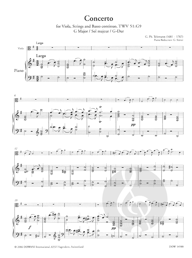 Georg Philipp Telemanns Konzert für Viola, Streicher und Basso continuo in G-Dur ist eines der ersten bedeutenden Konzerte für dieses Instrument. Telemann war einer der berühmtesten Komponisten des 18. Jahrhunderts. Es handelt sich um eine revidierte Ausgabe: Zu der bereits bestehenden DOWANI-Aufnahme gibt es nun einen neuen Klavierauszug und die Solostimme wurde von dem Bratschisten Leonid Leibowitsch mit Fingersätzen versehen.