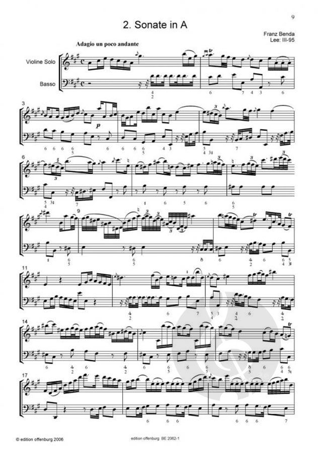 Herausgegeben nach dem Dresdner Manuskript von J. G. Pisendel. Franz Benda, der Konzertmeister der Hofkapelle Friedrichs II. war, komponierte über 100 Violinsonaten. Alle Autographe sind verschollen, es existieren lediglich Manuskripte verschiedener Kopisten. Die Ausgabe dieser Sonaten basiert auf einer Abschrift Johann Georg Pisendels. Edition Offenburg.