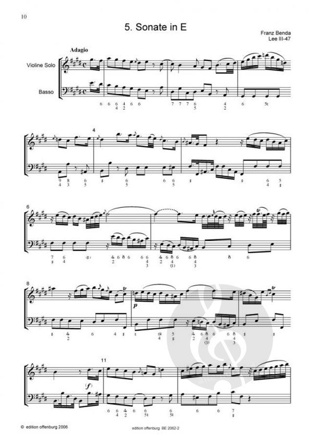 Herausgegeben nach dem Dresdner Manuskript von J. G. Pisendel. Franz Benda, der Konzertmeister der Hofkapelle Friedrichs II. war, komponierte über 100 Violinsonaten. Alle Autographe sind verschollen, es existieren lediglich Manuskripte verschiedener Kopisten. Die Ausgabe dieser Sonaten basiert auf einer Abschrift Johann Georg Pisendels. Edition Offenburg.