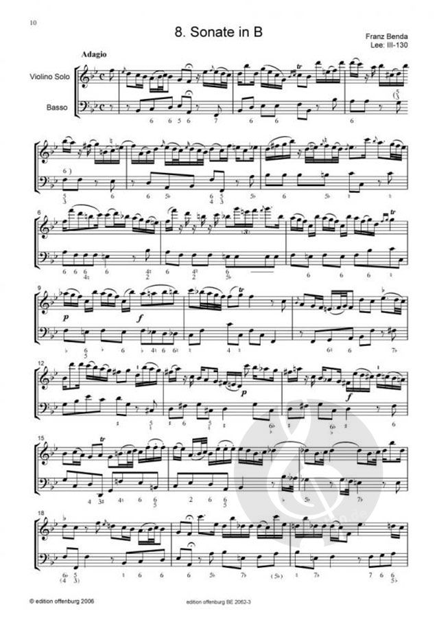 Herausgegeben nach dem Dresdner Manuskript von J. G. Pisendel. Franz Benda, der Konzertmeister der Hofkapelle Friedrichs II. war, komponierte über 100 Violinsonaten. Alle Autographe sind verschollen, es existieren lediglich Manuskripte verschiedener Kopisten. Die Ausgabe dieser Sonaten basiert auf einer Abschrift Johann Georg Pisendels. Edition Offenburg.