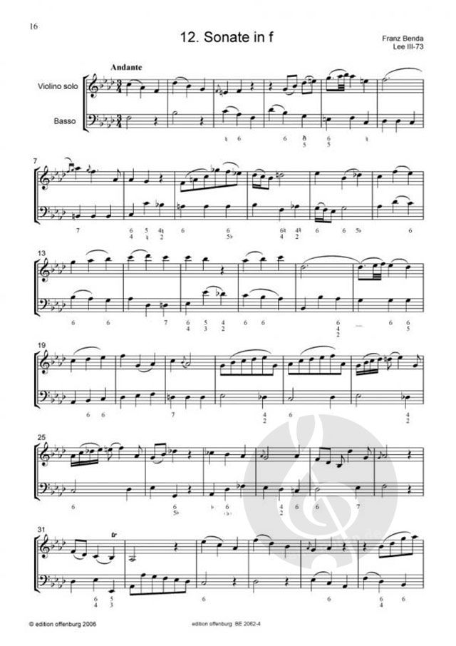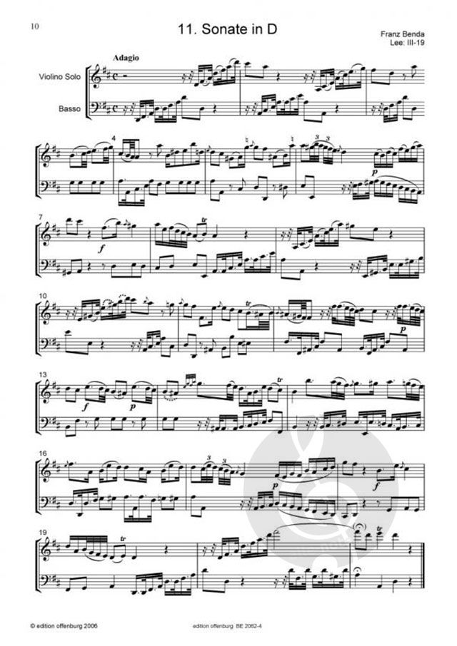 Herausgegeben nach dem Dresdner Manuskript von J. G. Pisendel. Franz Benda, der Konzertmeister der Hofkapelle Friedrichs II. war, komponierte über 100 Violinsonaten. Alle Autographe sind verschollen, es existieren lediglich Manuskripte verschiedener Kopisten. Die Ausgabe dieser Sonaten basiert auf einer Abschrift Johann Georg Pisendels. Edition Offenburg.