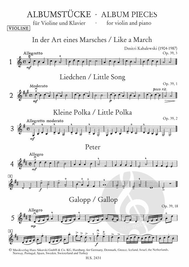 Dmitri Kabalewskis 'Albumstücke' für Violine und Klavier ist eine für diese Besetzung bearbeitete Zusammenstellung von 20 leichten Stücken, die aus seinen '24 kleinen Stücken op. 39', den '30 Kinderstücke op. 27' und weiteren Stücken kombiniert wurden. Alle Stücke stammen aus der Zeit von 1937 bis 1944.