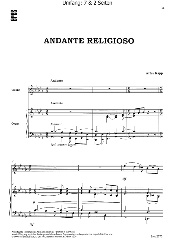 Für Violine und Orgel . Auff.-Dauer: 5'30 min. (III). (Auch in anderer Besetzung erschienen). Eres Estonia Edition