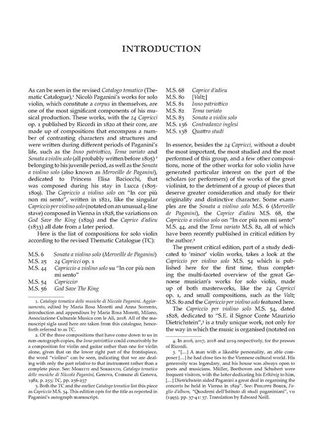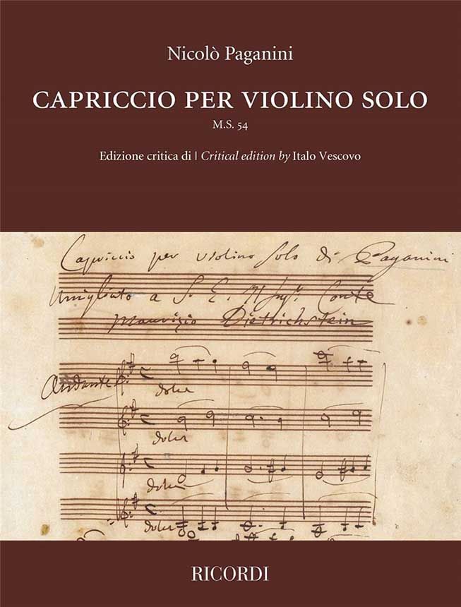 This Capriccio per violino solo M. S. 54 should be considered as part of the group of short musical dedications that Paganini was in the habit of giving away to friends, colleagues and the personalities he met during his travels. Dated 1828, dedicated to Count Maurizio Dietrichstein, is a truly unique work, not only for the way in which the music is organised (notated on four staves, one for each string) but also because of the way in which it was conceived musically. The concept of polyphony is brought to an extreme level, at least in conceptual and visual terms, in this composition. Its brief structure is reminiscent of a kind of four-part chorale written in score. It is characterised by its lyrical and elegant writing style, where the four voices move in polyphonic fashion, giving birth to an extremely refined harmonic texture. This critical edition is based on the manuscript kept in the Österreichische Nationalbibliothek of Vienna compared with the modern editions.