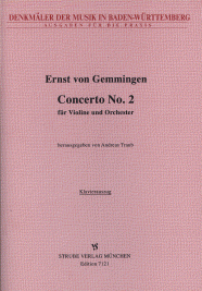 Erstausgabe (Reihe 'Denkmäler der Musik in Baden-Württemberg' Band 2 STRUBE9102). Prakt. Ausgabe. Die Stimme der Solovioline ist der Klavierausgabe beigelegt. - Ernst von Gemmingen-Hornberg (1759-1813) hatte 'besondere Anlagen für die Musik, und zwar war es die Violine, auf der er bedeutende Fähigkeiten erlangte'. Sein zweites Violinkonzert - eines von vieren, die erhalten sind (das erste Violinkonzert ist als praktische Ausgabe unter der Editionsnummer STRUBE7105 erschienen, das dritte Konzert unter STRUBE7127, das vierte schliesslich unter STRUBE7128) - lebt von der Spritzigkeit der Solovioline und dem gewandten Umgang Gemmingens mit dem Instrument und seinen Möglichkeiten.