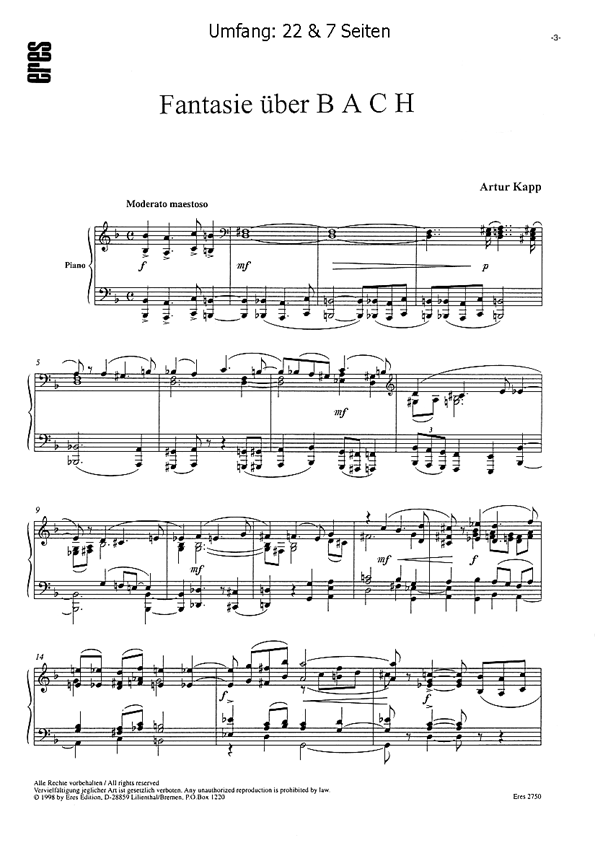Fassung für Violine und Klavier, herausgegeben von Vardo Rumessen.Artur Kapp ist hauptsächlich als Sinfoniker bekannt. Für Violine hat er nur einige vereinzelte Werke geschrieben. In dieser 'Fantasie' kommt A. Kapps Wertschätzung gegenüber dem großen Schaffen J.S. Bachs zum Ausdruck, für den er sein ganzes Lebenß hindurch eine besondere Vorliebe empfand. Neben dem Thema B-A-C-H verwendet er die 'Sarabande d-moll (aus der Französischen Suite Nr. 1). Eine beachtenswerte Komposition. Kapp verwendet das Thema dieser Fantasie auch in seinem Oratorium 'Hiob'. Eres Estonia Editionßß