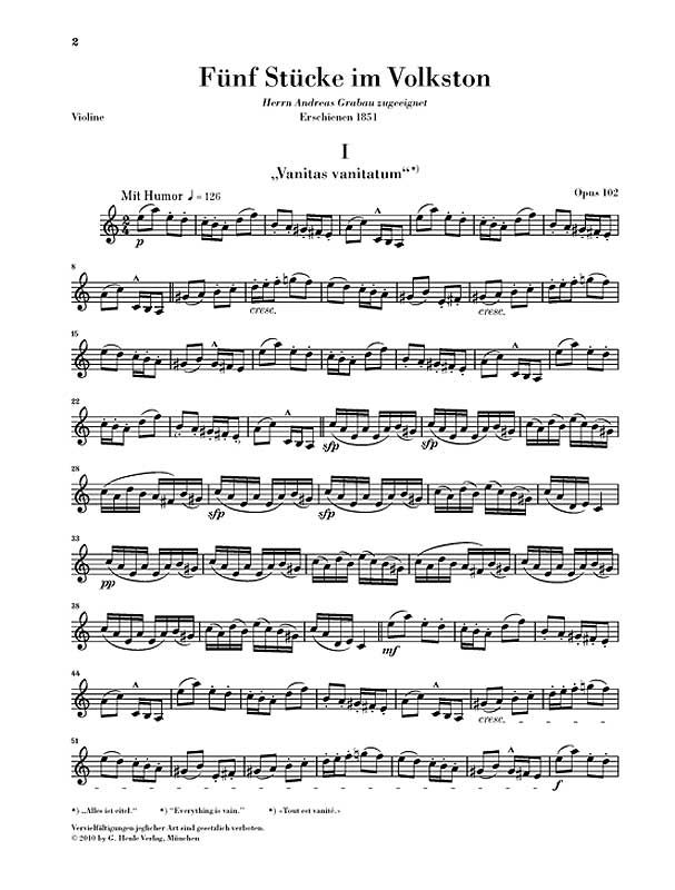 Wie die meisten von Schumanns Duos für Soloinstrument und Klavier erschienen auch die 'Stücke im Volkston', original für Violoncello und Klavier, in einer Alternativbesetzung. Der Verleger versprach sich von einer zusätzlichen Ausgabe für Violine eine höh