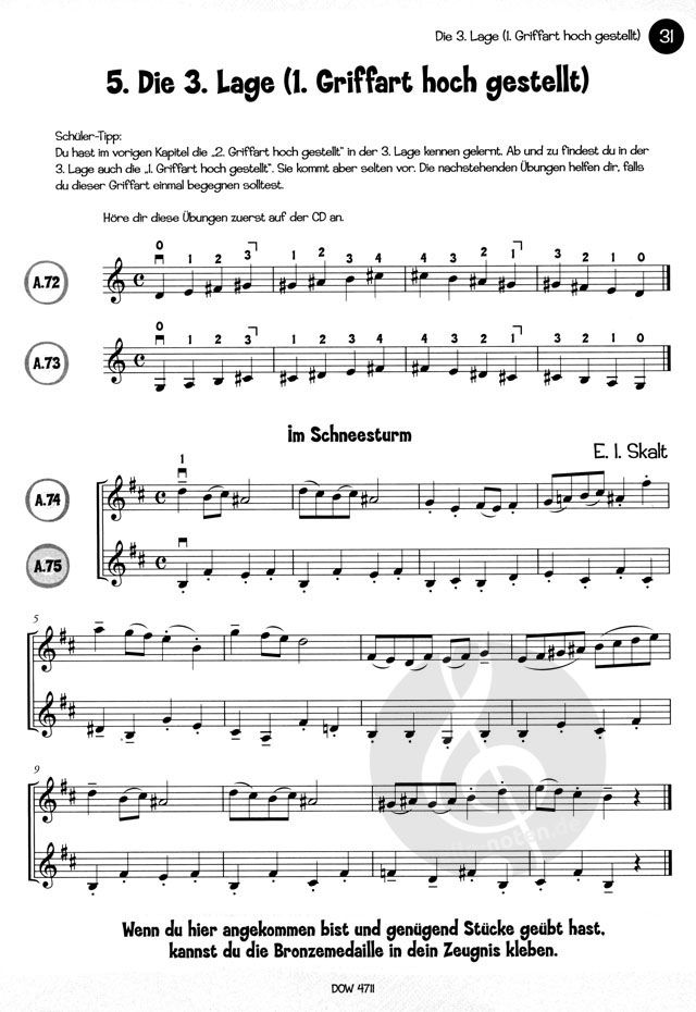 Themen: - Die 3. Lage in allen Griffarten - Wechsel zwischen der 1. und 3. Lage in allen Griffarten - Erweiterung der Stricharten - Bogenübungen - Fingerübungen - Tonleitern - Dreiklangübungen.