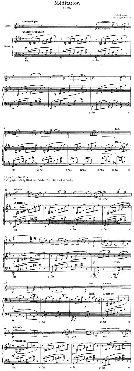 Das bei weitem berühmteste Stück des französischen Komponisten Jules Massenet, Méditation, stammt aus der Oper Thaïs, führte durch dessen Beliebtheit die Oper und auch Massenet zu großem Erfolg. In der Geschichte symbolisiert diese Melodie die Bekehrung der Hauptfigur Thaïs zum Christentum, doch ihre Melodramatik wirkt auch abseits der Bühne. Oft wird das Stück als Zugabe genutzt, oder im Gottesdienst, mit Verweis auf den Bezug zum Christentum in Thaïs. Die Meditation gibt dem Spieler eine relativ simple Basis, um in der Interpretation höchste Gefühle auszudrücken.