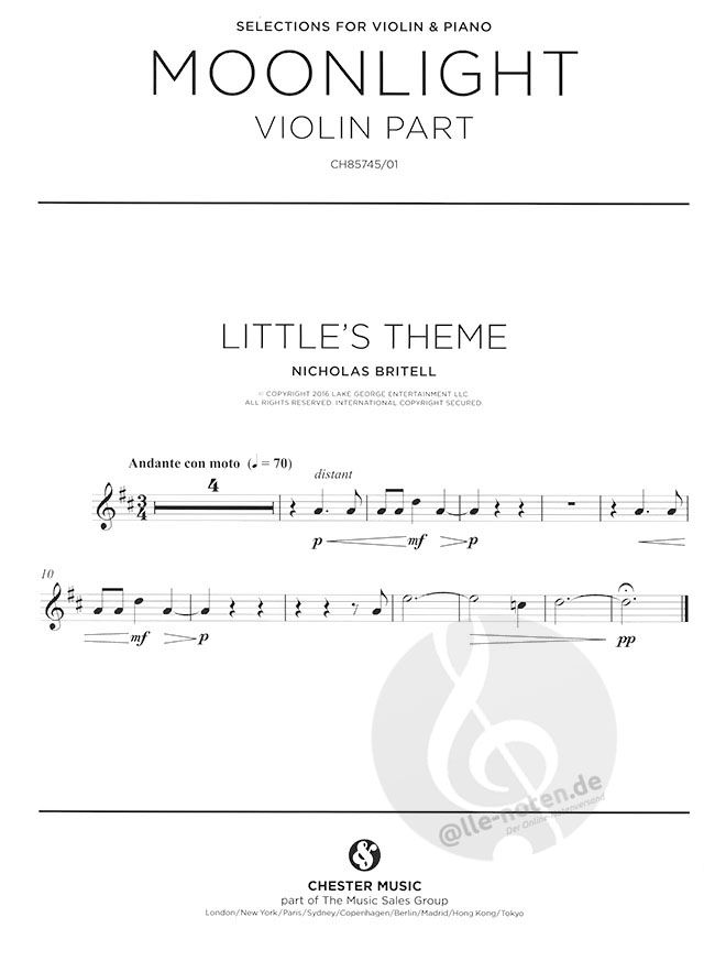 Written and directed by Barry Jenkins, the 2016 film Moonlight received universal acclaim upon its release with critics praising the acting, direction, screenplay, cinematography, subject matter and score. The film was awarded Best Motion Picture - Drama at the 74th Golden Globes and has received eight Oscar nominations. This exclusive folio features selections from Nicholas Britell 's score, arranged for Violin and Piano by the composer. This book features three themes from the film - Little's Theme, The Middle Of The World and The Culmination. It also includes a unique preface and full-page images from the film. Moonlight - Selections For Violin & Piano includes the Piano score and a pull-out Violin part. Watch the trailer for Moonlight :