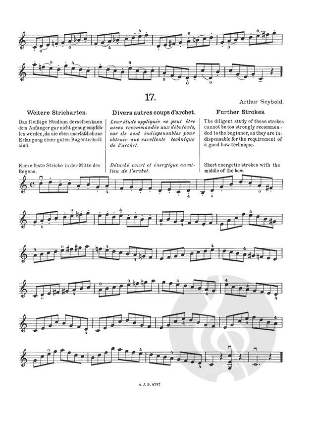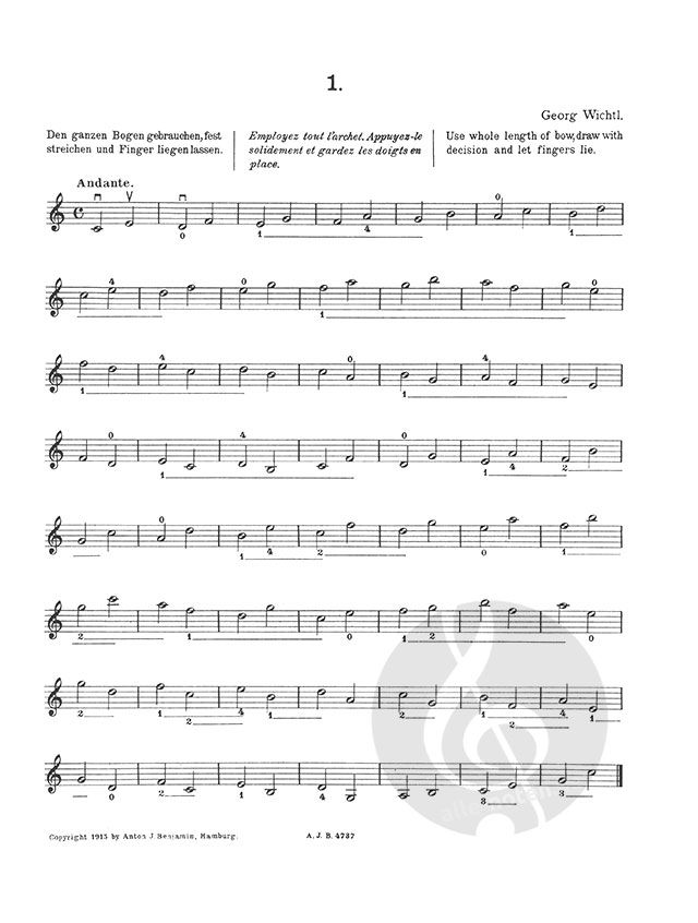 Eine Auswahl der wertvollsten Etüden in progressiver Reihenfolge. Etüden in der 1. Lage von Alday, Bach, Benda, de Beriot, Bruni, Capoagnoli, Corelli, David, Dont, Fiorillo, Gavinies, Herold, F.A. Hoffmann, v.d. Hoya, Kayser, Kreutzer, Leclair, Locatelli, Lolli, Maurer, Mayseder, Mazas, Meerts, Mestrino, L. Mozart, Paganini, Pichl, Rode, Rovelli, Saint-Lubin, Schloming, Schoen, Seybold, Spohr, Wichtl und Wohlfart, in progressiver Reihenbolge, vom ersten Anfang bis zur höchsten Vollendung.