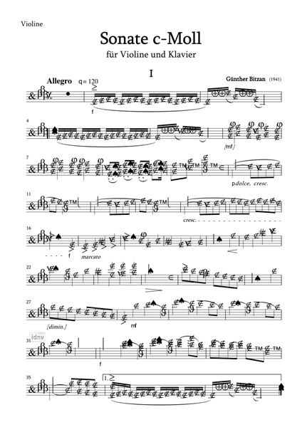für Violine und Klaviervon Günther BitzanI. Satz: AllegroII. Satz: AndanteIII. Satz: MenuettoIV Satz: RondoZur Musik Die Sonate für Violine und Klavier in c-Moll gehört zu den frühesten erhaltenen Kompositionen Bitzans. Das undatierte Werk stammt mutmaßlich aus der ersten Hälfte des Jahres 1941; es ist die erste dokumentierte Auseinandersetzung des jugendlichen Autors mit einer mehrsätzigenSonatenform. Zwei weitere undatierte Kompositionen (Menuetto und Ländler für Violineund Klavier; Tänze für zwei Geigen und Cello) sind ebenfalls in die Zeit um 1940/1941 einzuordnen.Bitzan bedient sich zu dieser Zeit eines klassizistischen, vollständig in den Grenzender Dur-Moll-Tonalität verharrenden Kompositionsstils. Die verwendeten Formen und Gattungenlassen auf eine Orientierung an der Musik Wolfgang Amadeus Mozarts und Ludwig van Beethovens schließen. Die vorliegende Sonate zeigt deutliche Merkmale einer Schülerarbeit, deren Satztechnik und Formgestalt vermuten lässt, dass der 13jährige Komponist noch keine systematische Unterweisung im Fach Komposition genossen hatte und sich intuitiv an stilistischen Vorbildernorientierte, die er aus dem eigenen Instrumentalunterricht kannte. Während der Beginn desKopfsatzes vom Gestus und Themenbau des Beginns der c-Moll-Violinsonate Ludwig van Beet-hovens (op. 30 Nr. 2) inspiriert zu sein scheint, offenbaren sich im weiteren Satzverlauf strukturelleSchwächen: Der Seitensatz der Exposition erscheint gegenüber der weitschweifigen Überleitungspassage,die ihm vorangeht, zu leichtgewichtig; die Exposition findet ihrerseits keinangemessenes Gegengewicht in dem folgenden Formteil, der Charaktere einer Durchführungund Reprise in sich vereint, ohne einen klar erkennbaren Wiedereintritt des Hauptthemas inder Grundtonart zu präsentieren. Da die Manuskriptfassung, die über weite Strecken in c-Mollverbleibt, zudem keinen überzeugenden Tonartenkontrast bietet (gegen Ende erscheint einkurzer Exkurs in die Oberquinttonart g-Moll, der zum Satzschluss fast gewaltsam wieder zurückzur Ausgangstonart geführt wird), erschien es mir geboten, in den Modulationsweg desSatzes einzugreifen, auch wenn dadurch die formalen Probleme unangetastet bleiben (siehehierzu den Revisionsbericht). Das an zweiter Stelle stehende Andante sowie das folgende Menuett erweisen sich alsüberzeugendere Lösungen hinsichtlich der Beherrschung der gewählten Formen. Beide stehen,ungewöhnlich angesichts der Haupttonart des Werkes, in D-Dur. Der tänzerische III. Satz kannals eine gelungene Stilstudie nach Menuettsätzen der Wiener Klassik gelten, während der II.Satz ähnliche Proportions- und Tonalitätsprobleme aufweist, wie sie im Kopfsatz beobachtetwerden konnten. Die wesentliche Stärke des jungen Komponisten ist die melodische Erfindung,wie sie sich durchweg in der organisch gearbeiteten Violinstimme zeigt. Folglich betreffen diemeisten editorischen Eingriffe den Klaviersatz, dessen Manuskript vielerorts unter ungünstigenVerdopplungen von Akkordtönen, repetitiven Begleitungsstrukturen und gelegentlich untereiner zu basslastigen Registerwahl leidet. Das lebhafte Finale kehrt zur Ausgangstonart c-Mollzurück; obgleich es als Rondo betitelt ist, präsentiert es vielmehr eine potpourri-artige Abfolgevon Themen und Einfällen in wechselnden Charakteren und Tonalitäten. Die einzige Wiederkehrdes Hauptthemas erscheint, eher die Reprise einer Sonatenhauptsatzform denn eineRefrainstruktur nahelegend, im letzten Viertel des Satzes. Die Partitur des Werkes liegt als Reinschrift in schwarzer Tinte vor; außerdem existierteine separate Violinstimme in gleicher Tinte, in die mit Bleistift aufführungspraktische Eintragungen(Taktzahlen und Fingersätze) vorgenommen wurden. In der vorliegenden Edition wurdeim Abweichungsfall der Partitur Vorrang gegeben. Das letzte Blatt der Violinstimme trägtden handschriftlichen Hinweis »Uraufgeführt am 27. Juli 1941 in Gegenwart der Nachstehenden:«, gefolgt von vier Unterschriften (mutmaßlich von Verwandten oder Lehrern Bitzans).Wer die Interpreten der offenbar in privaten oder schulischen Räumlichkeiten stattgefundenenUraufführung gewesen sind, ist nicht dokumentiert. Diese Edition ist meinem Großvater Tassilo Bitzan (* 1923), dem älteren Bruder GüntherBitzans, gewidmet, der den musikalischen Nachlass des Komponisten nach dessen Tod archiviertund ihn mir an Weihnachten 2013 zur weiteren Verwahrung übergeben hat.Wendelin BitzanBerlin, im September 2015