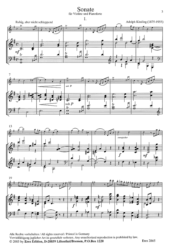 Kissling wurde 1875 in Bremen geboren. Seine Mutter, Sophia Kissling geb. Todt, war Gesangschülerin bei Rheintaler und sang im Bremer Domchor.ß Adolf Kisslings Vater, Gustav Kissling, war Altphilologe und komponierte ebenso wie dessen Bruder. So bekam Adolf Kissling durch das Elternhaus früh Zugang zur Musik.Gern wäre Kissling Musiker oder gar Dirigent geworden, jedoch hielten seine Eltern dies nicht für Erfolg versprechend. Schliesslich wurde Kissling ein beliebter Pädagoge an einer Realschule in der Bremer Altstadt. Adolf Kissling selber spielte Klavier und erfreute sich als Begleiter und Mitspieler großer Beliebtheit. Zeitgenössische Komponisten interessierten ihn sehr und er selbst musizierte mit Richard Strauss, mit Reger, Pfitzner, Korngold und weiteren.Er hinterliess bei seinem Tode im Jahre 1955 '24 Lieder' und eine 'Sonate', die hier erstmals gedruckt vorgelegt wird. Die Sonate komponierte er in den 1920er Jahren, diese wurde erstmals in den 1950er Jahren durch seinen Sohn Karl Adolf Kissling (Violine) und später von seiner Tochter Reinholde Schulz (Klavier) aufgeführt. Nun hat seine Enkelin Susanne Schulz (Violine) das Werk neu entdeckt und zusammen mit Miyuki Motoi (Klavier) auf einer CD eingespielt (eres-CD 34).Diese Sonate weist für ein 'Erstlingswerk' eine erstaunliche kompositorische Reife auf und so wirft sich die Frage auf, warum Adolf Kissling nicht mehr komponiert? Vielleicht lag dies an den großen beruflichen Aufgaben und seinen familiären Verpflichtungen, dass nicht mehr Musik in seinem Haus mit dem Motto 'Zum frohen Leben' geschrieben wurde.ßß
