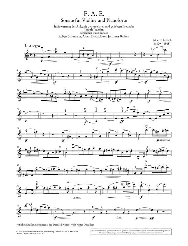 In Band 2 der Violinsonaten von Robert Schumann legt die Wiener Urtext Edition die von Schumann, Brahms und Albert Dietrich als Gemeinschaftskomposition verfasste F.