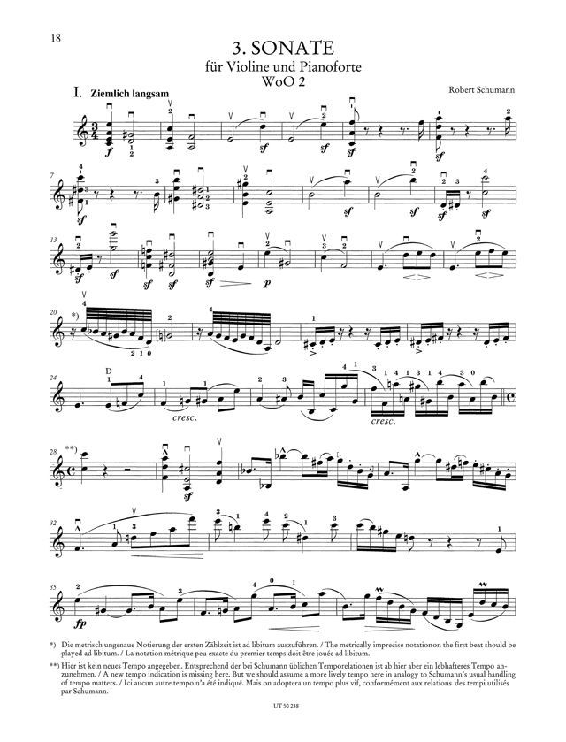 E-Sonate vorwiegend um Detailveränderungen artikulatorischen Bereich, im Falle der 3. Violinsonate Schumanns um gravierendere Veränderungen gegenüber dem erst 1956 erschienenen Erstdruck und einer hiervon nur geringfügig revidierten Neuausgabe von 1988. Die durch die überlieferten Quellen bisher nicht eindeutig zu klärende Abfolge der Mittelsätze ist aufgrund neu aufgefundener Dokumente gegenüber den früheren Ausgaben geändert worden. Neben weiteren Änderungen weist die Neuausgabe gegenüber dem Erstdruck eine Variante für den von Schumann nicht ausgeschriebenen Takt 100 im 1. Satz aus.