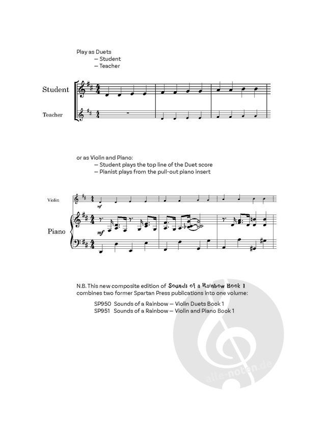 Kombiniert und ersetzt die beiden Originalveröffentlichungen von Sounds of a Rainbow Book 1 von Spartan Press (SP950-1) in diesem Band, der sowohl Duette als auch Versionen für Violine und Klavier in einem Band enthält.