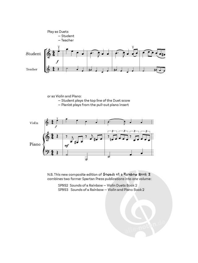 Die Inspiration, die Stücke für dieses Buch zu schreiben, kam mir aus dem Wunsch heraus, den jungen Kindern, die ich unterrichte, Musik zu geben, die ihr Gehör für gute Intonation und schöne Tonerzeugung entwickelt. Alle Stücke haben eine stark angedeutete harmonische Struktur, so dass sie ohne Begleitung gespielt werden können. Der Zweck der zweiten Geigenstimme ist es daher, dem Lehrer die Möglichkeit zu geben, die Harmonie zu unterstreichen und die Tonerzeugung und Intonation des Schülers durch seinen eigenen Klang zu beeinflussen, da vieles durch gutes Beispiel gelehrt werden kann. Der Geigenschüler hat auch die Möglichkeit, mit Klavier zu spielen. Die in diesem Buch enthaltenen Begleitungen sind von Heidi Rolfe geschrieben.