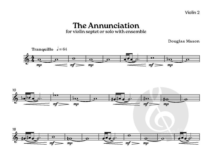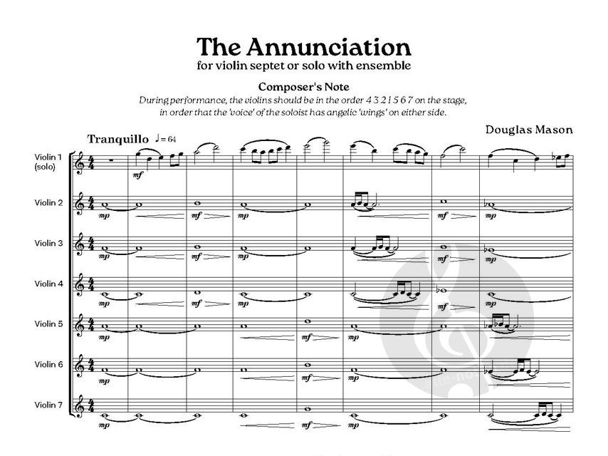 The Annunciation ist eine Instrumentalbearbeitung des eigenen Stücks für Oberstimmen, Angelus ad Virginem, und stellt die biblische Szene dar, in der der Engel Gabriel Maria über die bevorstehende Geburt Jesu informiert. Mit seiner ruhigen, hohen solistischen Schreibweise und der Verwendung von Polychorden ist das Stück vor allem als Erlebnis für den Zuhörer gedacht, der in der Rolle Marias eine musikalische Darstellung der Engelsstimme vernimmt.