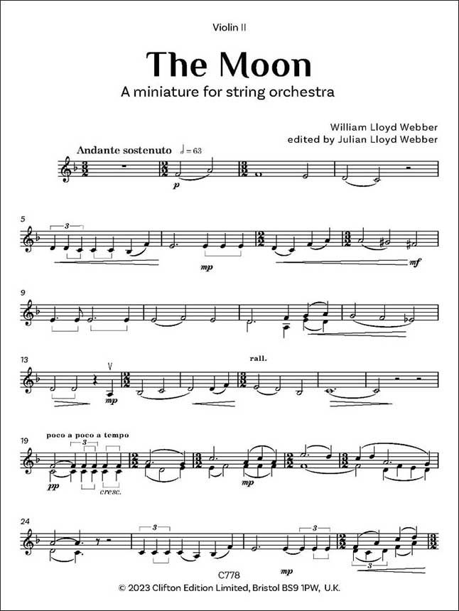 Herausgegeben von Julian Lloyd Webber. Julian Lloyd Webber schreibt: "Mein Vater komponierte sein vierstimmiges Lied 'The Moon' 1959 zu einem Text von W.H. Davies. Der Text setzt - wie in so vielen seiner Vertonungen - die Natur mit der Menschheit gleich: "Deine Schönheit sucht mich heim, Herz und Seele". Obwohl 'The Moon' bis zu seinem hundertsten Geburtstag im Jahr 2014 nicht aufgeführt wurde, fühlte er sich offenbar stark genug, um diese Miniatur für Streichorchester zu schaffen." Diese Musik ist in einem Set erhältlich, das eine vollständige Partitur und 10 Stimmen enthält. Zusätzliche Einzelstimmen sind erhältlich: C777 Einzelstimme Violine I, C778 Einzelstimme Violine II, C779 Einzelstimme Viola, C780 Einzelstimme Violoncello, C781 Einzelstimme Kontrabass.