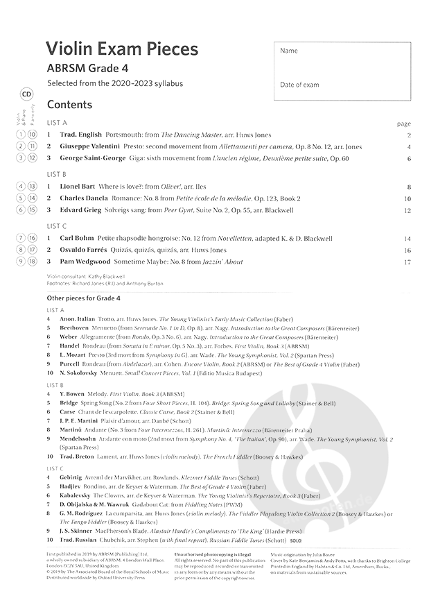 Violin Exam Pieces 2020-2023, ABRSM Grade 4, Score, Part & CD