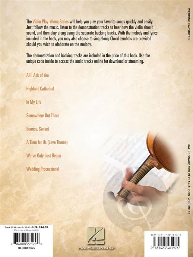 The Violin Play-Along Series will help you play your favorite songs quickly and easily. Just follow the music, listen to the Online Audio to hear how the violin should sound, and then play along using the separate backing tracks. With the melody and lyrics included in the book, you may also choose to sing along. Chord symbols are provided should you wish to elaborate on the melody. The audio Online Audio is playable on any Online Audio player, and also enhanced so PC & Mac users can adjust the recording to any tempo without changing pitch! This volume includes the wedding standards: All I Ask of You - Highland Cathedral - In My Life - Somewhere Out There - Sunrise, Sunset - A Time for Us (Love Theme) - We've Only Just Begun - Wedding Processional.