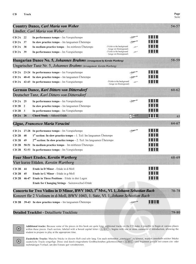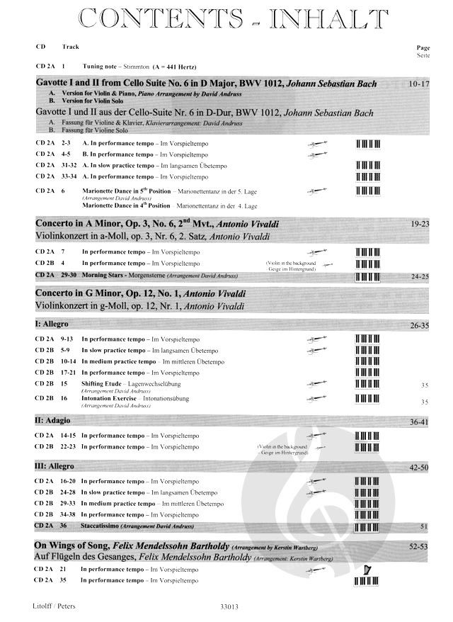 Im Mittelpunkt dieses Heftes steht die sichere Erarbeitung des Violinkonzertes in g-Moll, op. 12, Nr. 1 von Vivaldi sowie einzelner Sätze von J.S. Bach, Weber, Dittersdorf, Mendelssohn Bartholdy, Veracini und Brahms.