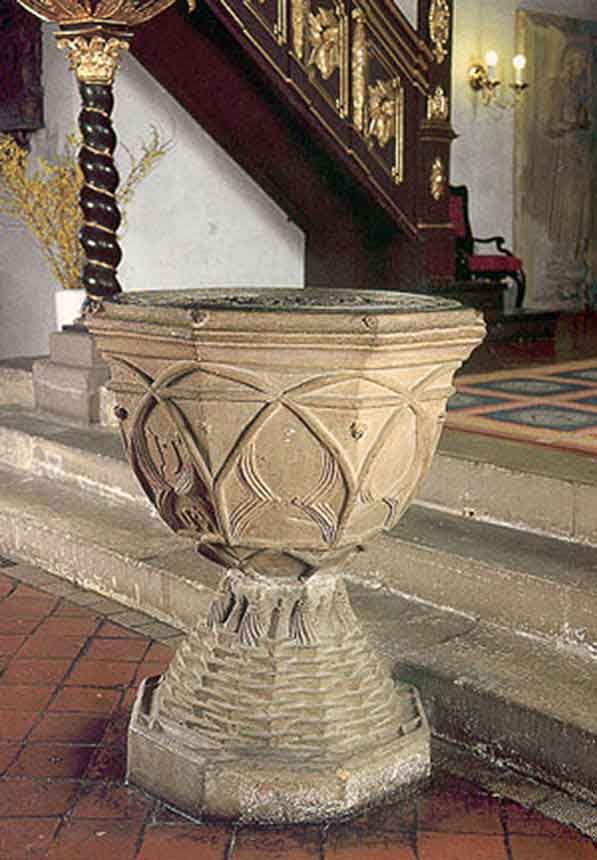 Taufstein von 1503. Hier wurde J.S. Bach am 23. März 1685 getauft. Foto: Joachim Thurau, Eisenach 1999