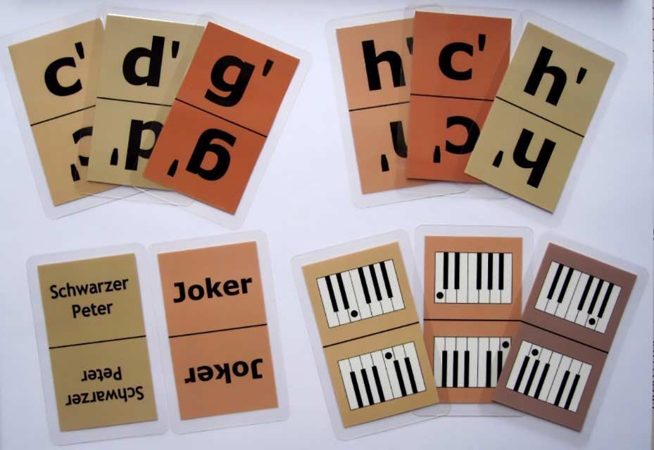 Mit dem Notenkartenspiel für Klavier lassen sich nun auch populäre Kartenspiele wie Mau-Mau, Schwarzer Peter, Halli-Galli und Quartett so spielen, dass dabei die Stammtöne c' bis h' (notiert im Violinschlüssel) gelernt und vertieft werden. Auch Dominospiele und Memospiele können gespielt werden.